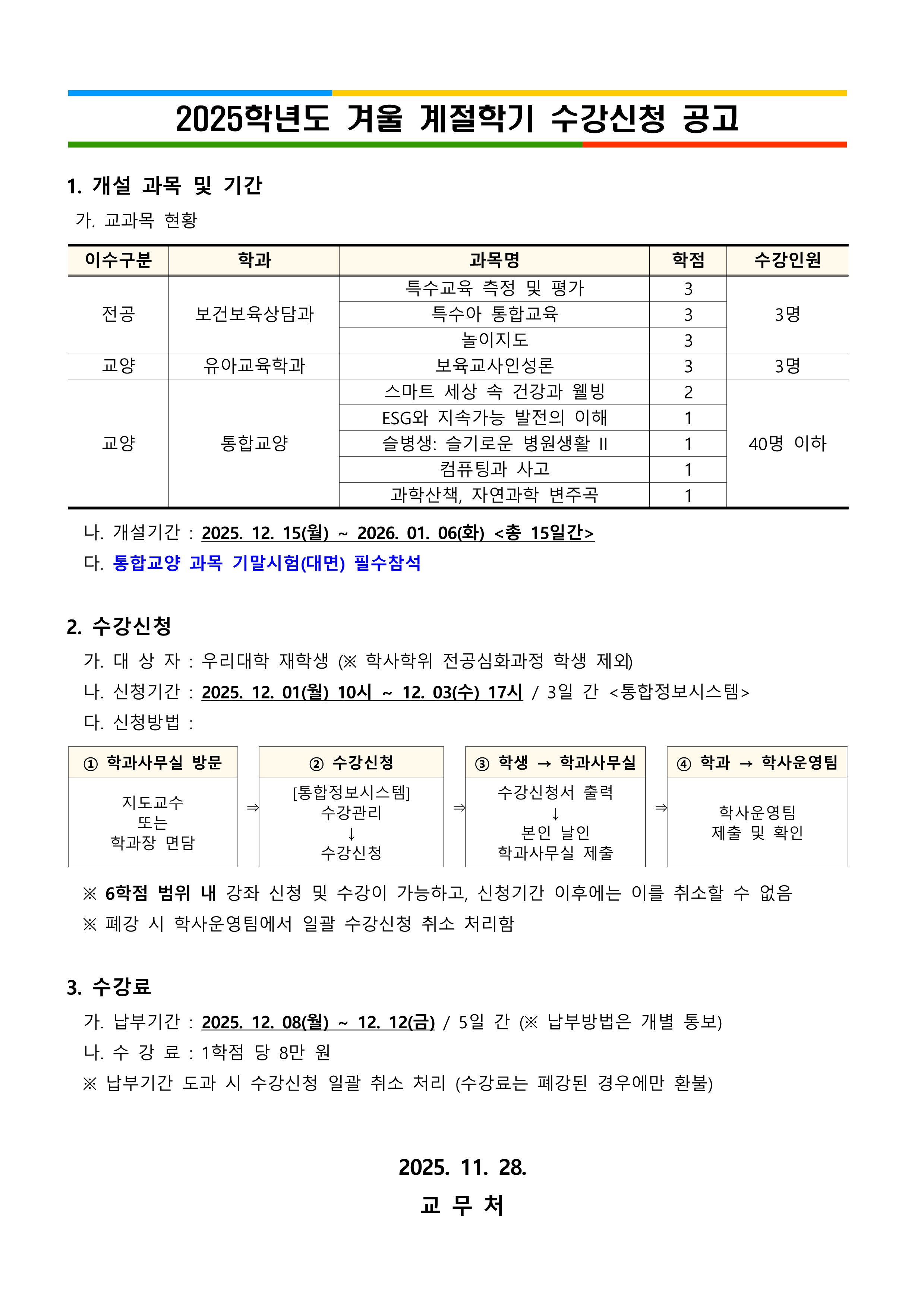 학칙 제38조(수강신청)에 근거하여 2025학년도 겨울 계절학기 재학생 수강신청을 다음과 같이 공고합니다.