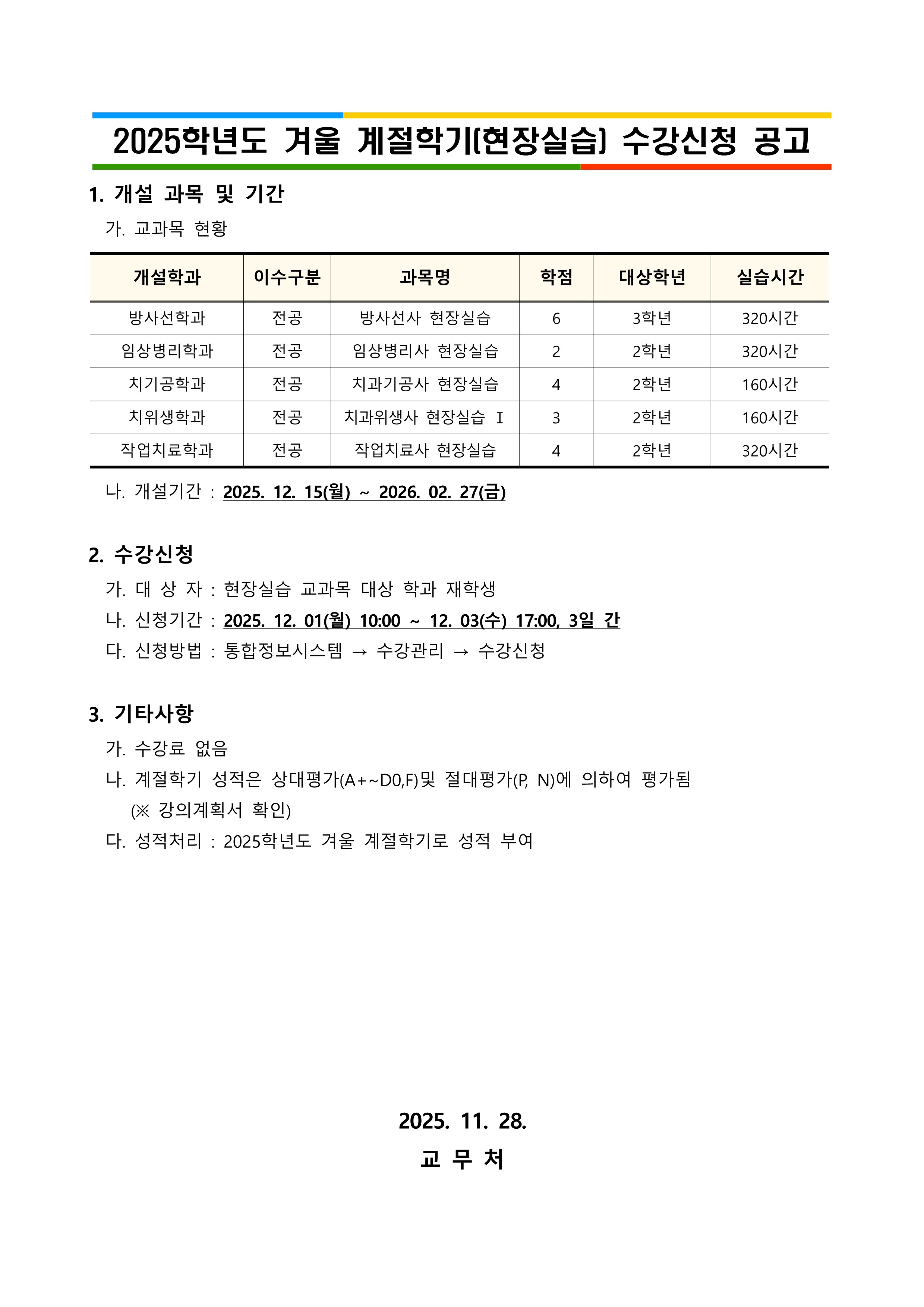 학칙 제38조(수강신청)에 근거하여 2025학년도 겨울 계절학기 현장실습 수강신청을 다음과 같이 공고합니다.